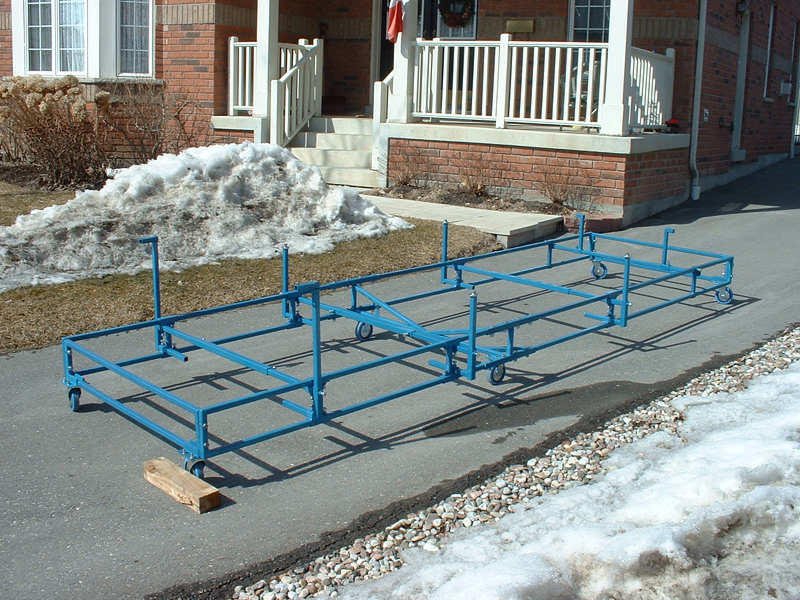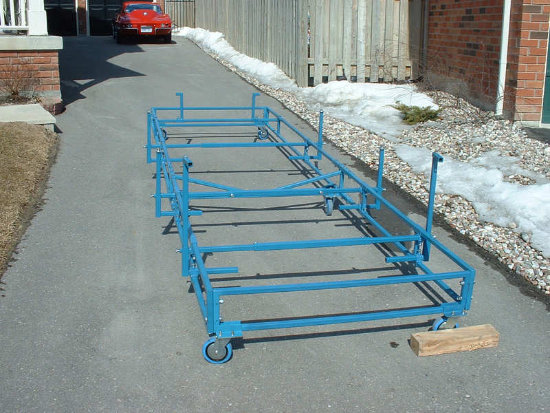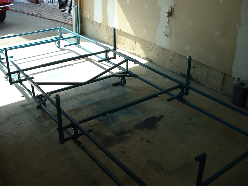 In the beginning we did as many other folks do, we supported the body on barrels and boards, 2x4 wood frames and of course on the frames themselves. This all let to our creation of a steel 2”x2”x1/4” square tubing support dolly on wheels. This gave us the mobility for the body in the shop and added the rigidity we desired while off the frame. This was a good unit but it fell short in the convenience aspect. When not in use it was very bulky and awkward to move around. We used to stand it on it's side and slide it behind the tool boxes and shelving along the side of the garage.