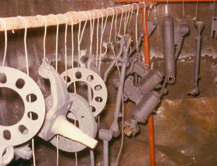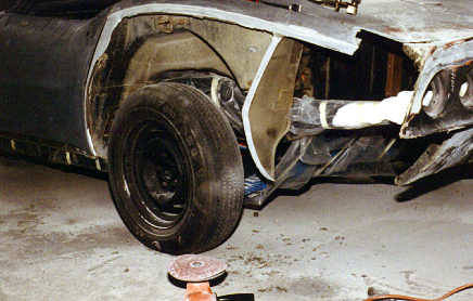 The metalflake paint was stripped using razor blades as far as the seam in the fenders, then the fenders were removed and new ones installed. Finally we sprayed some primer and the car looked like it was taking shape, plenty of block sanding later we gave it six coats of red lacquer and four coats of clear lacquer. It sat for two weeks to let the paint cure and then we wet sanded and buffed the finish.